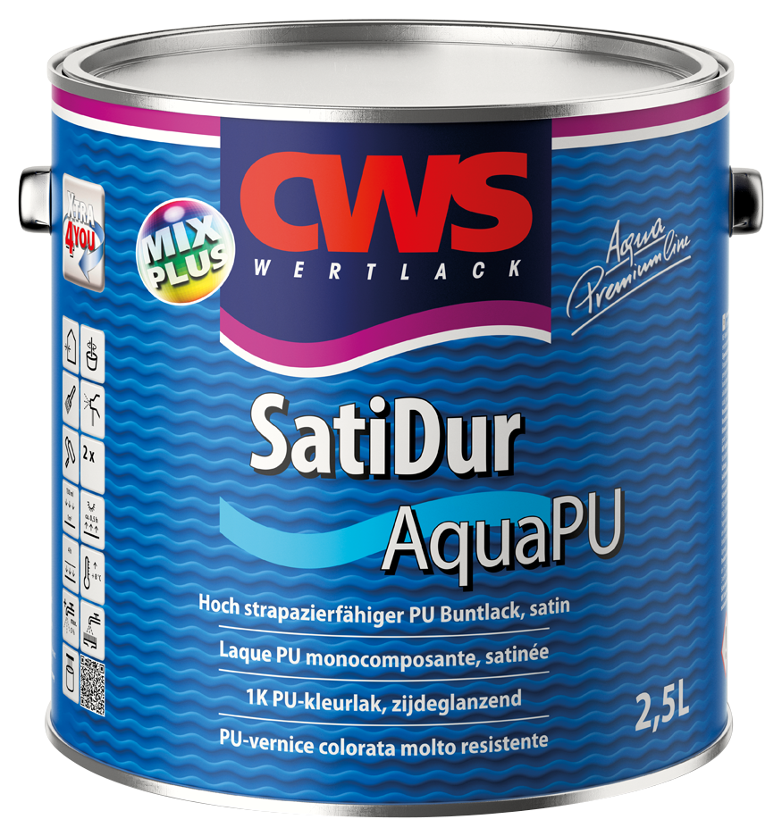 CWS Satidur Aqua PU Satin is een watergedragen lakverf met polyurethaanversterking die zorgt voor een extra harde en slijtvaste verflaag. Hierdoor is deze lak bijzonder geschikt voor oppervlakken die intensief worden gebruikt, zoals deuren, kozijnen en meubels.
